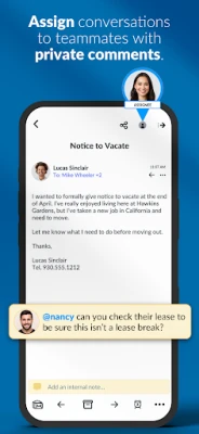 Your Aptly inboxes are designed to be collaborative and shared. Put an end to the endless CCs and FWDs that clutter team inboxes. You can assign any conversation to teammates and include private notes. Use powerful inbox rules to route conversations to the right teammate automatically based on a sender info (ie. data from the property management software) and ensure timely follow up. Your team can use saved communication templates to respond to common questions with a few taps.